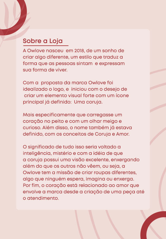 A Owlove nasceu em 2018, de um sonho de criar algo diferente, um estilo que traduz a forma que as pessoas sintam e expressam sua forma de viver. Com a proposta da marca Owlove foi idealizado o logo, e iniciou com o desejo de criar um elemento visual forte com um ícone principal já definido: Uma coruja. Mais especificamente que carregasse um coração no peito e com um olhar meigo e curioso. Além disso, o nome também já estava definido, com os conceitos de Coruja e Amor.